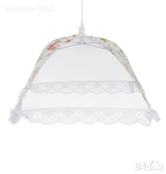Защитна мрежа - покривало за храна. Той е сгъваем в квадратна форма, бял на цвят с флорални страни и дантелена гарнитура. Покрива чинии с храна или купи с плодове и предотвратява сядането на мухи, насекоми и комари върху храната. Фината мрежа позволява на въздуха да циркулира и предотвратява влагата. Идеален е за дома, балкона, провинцията и къмпинга. Но също така е полезно на парти, пикник или къмпинг.