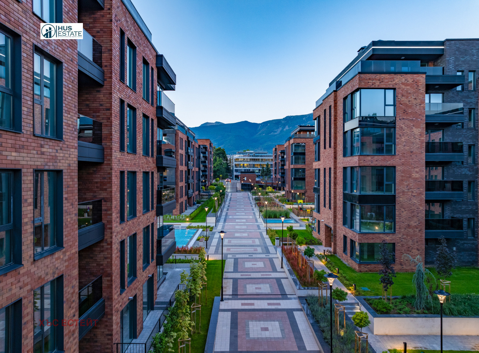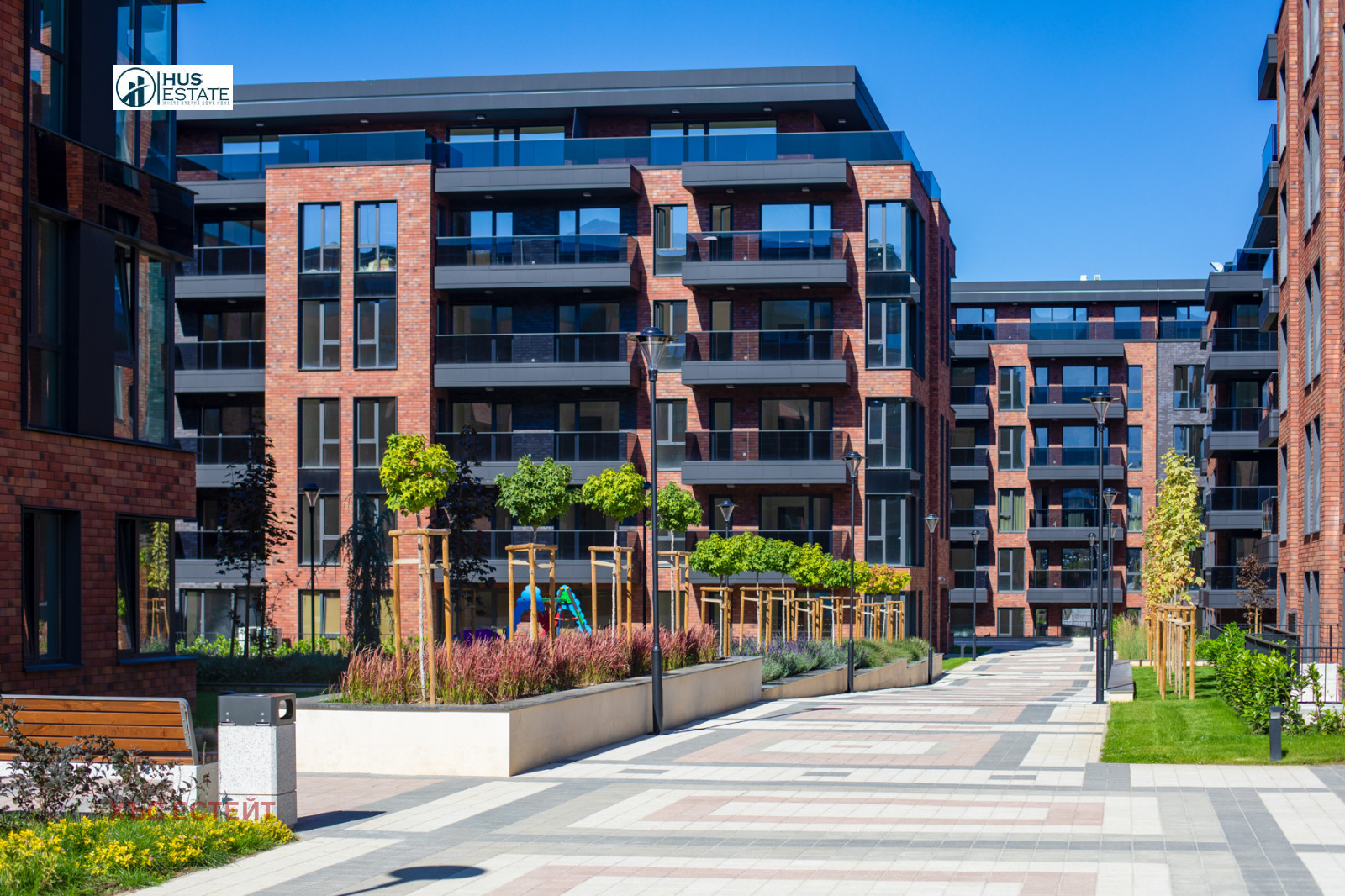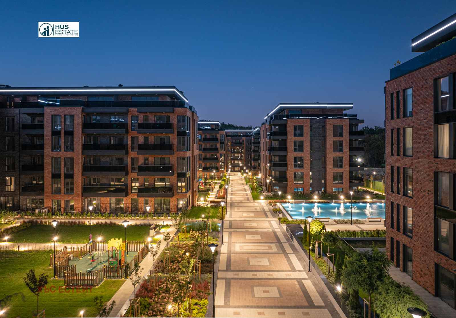 Вътрешният двор на комплекса е над 30 декара, изцяло пешеходен, в който са разположени общо 9 детски площадки, за различни възрасти.