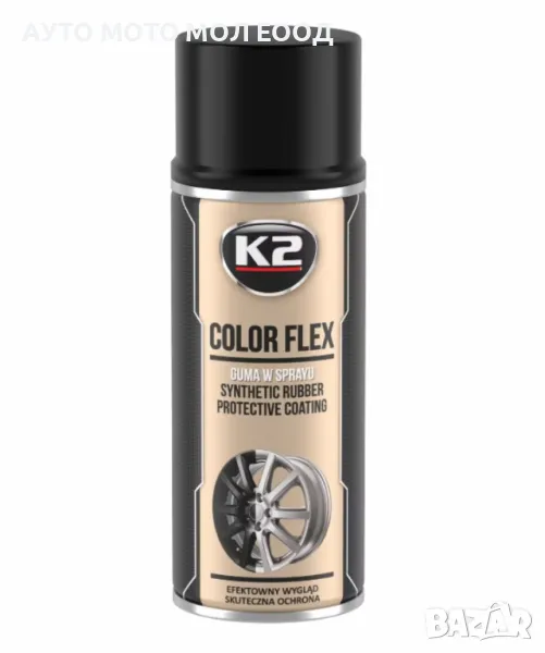 Боя K2 Color Flex гумиран ефект, синтетична ,мултифункционална, специална гумена боя, която съхне без изпичане. Нанася се лесно. Защитава повърхността от влага, киселини, корозия, нараняване.Запазва еластичност във времето, като не се напуква или деформира при тежки атмосферни условия. Боята е преминала успешно тестове при температури от -30°C до 90°C. Може да се нанася върху метал, пластмаса, алуминий, стъкло, дърво и т.н.