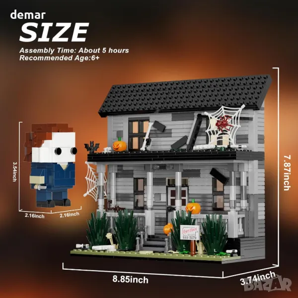 Комплектът представлява къщата на Майкъл Маерс от Хелоуин, с висока степен на възстановяване на образа и много детайли като паяци, прилепи, тикви и фигура с нож. Перфектен подарък за Хелоуин, който осигурява забавление и удовлетворение при изграждането му. Включва ясни инструкции, подходящи за деца и родителски дейности. Продуктите са тествани за качество.