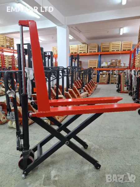 Разполагаме и с къси палетни колички, на цена 391, 00лв /жълтите на снимката/, дълги палетни колички/червените на снимката/ на цена 850лв, с дължина на вилиците 180см, кантарни палетни колички на цена 1020, 00лв и ножични 1125, 00лв, цените са без дан. доб. ст-ст.