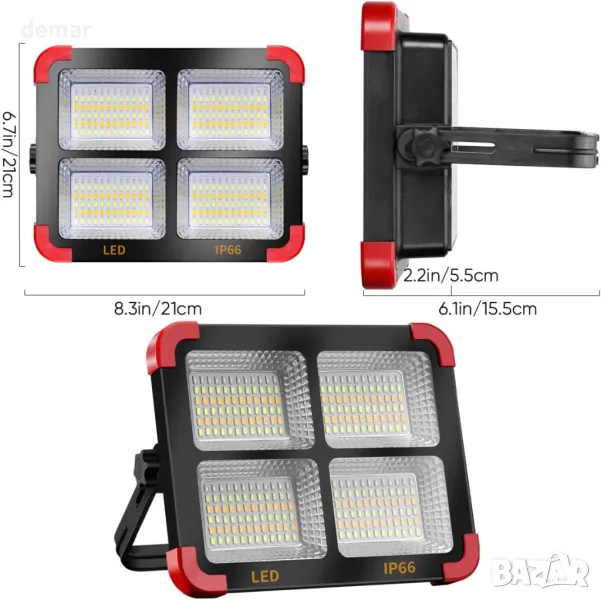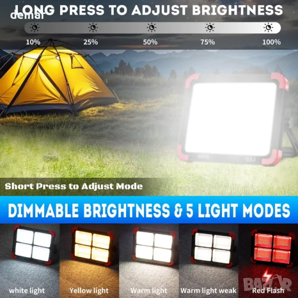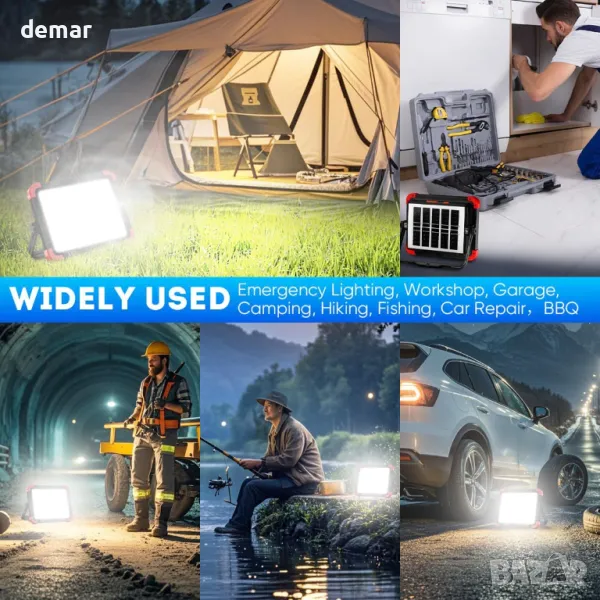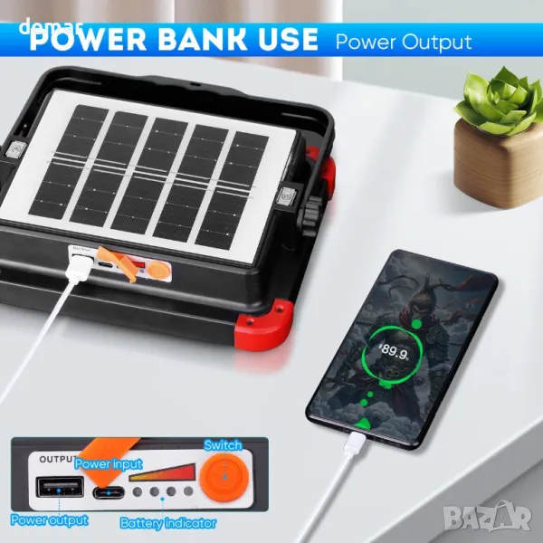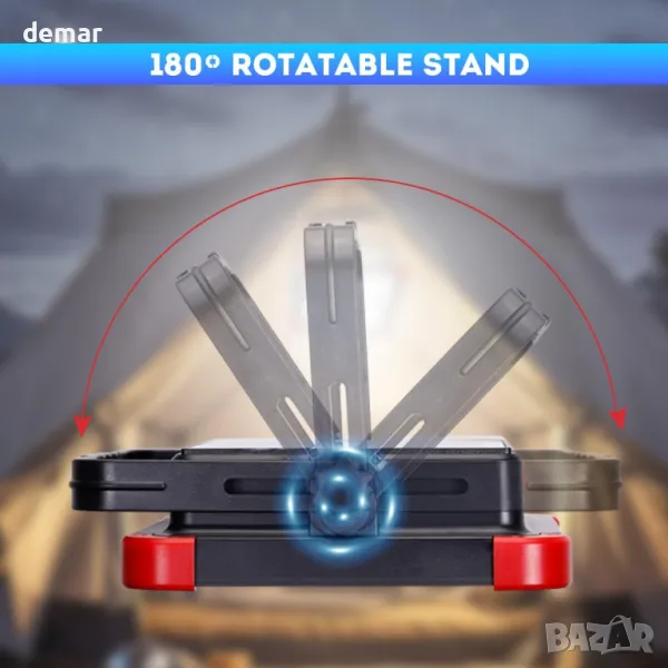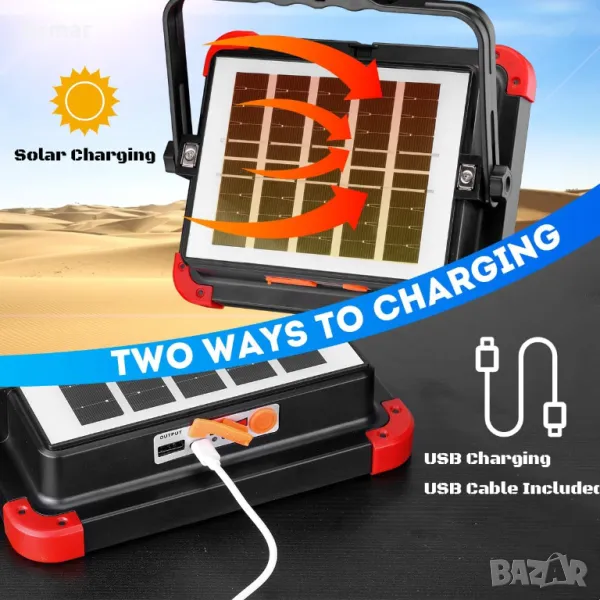 работна лампа с 5 светлинни режима, включително ярка бяла светлина, топла светлина, и червена мигаща светлина, за различни нужди. С вградени магнити за закрепване към метални повърхности. Захранва се чрез USB и слънчево зареждане с вграден 4800mAh акумулатор, зареждането отнема 4-6 часа. С IP66 водоустойчивост и удароустойчива конструкция, подходяща за работа на открито, къмпинг, ремонти, аварийни ситуации и повече. 180° регулируем статив за осигуряване на многостранно осветление.