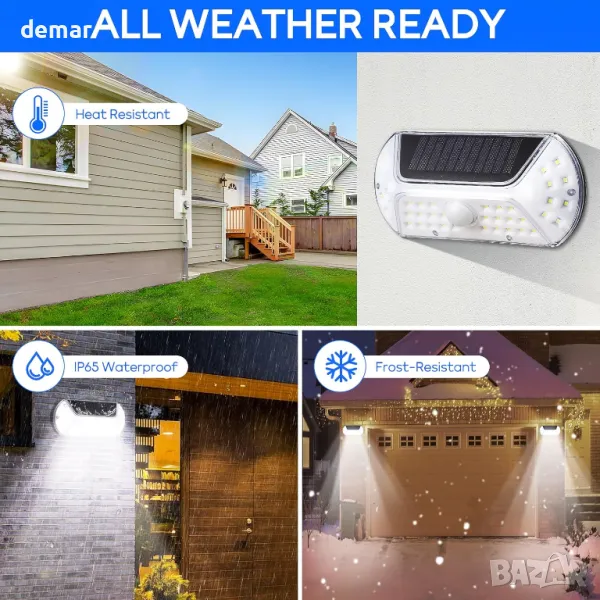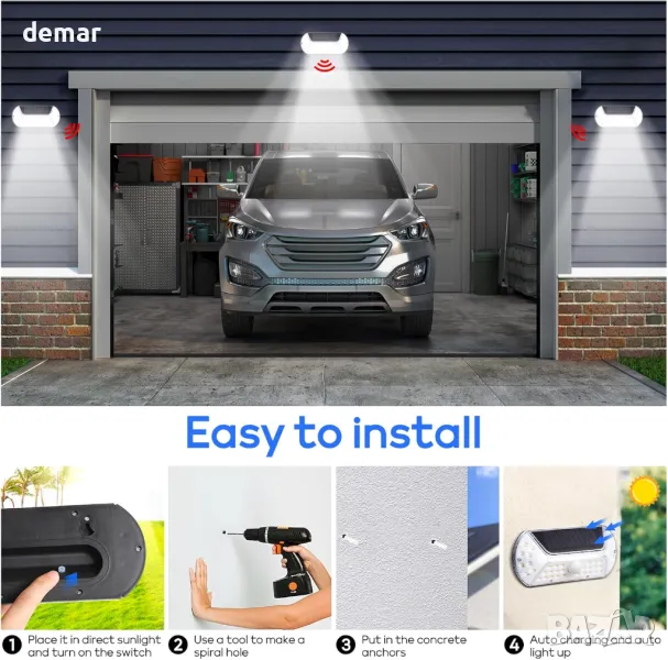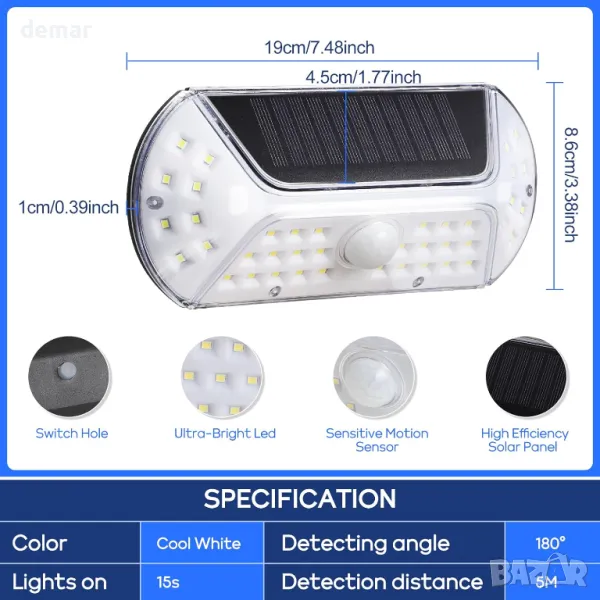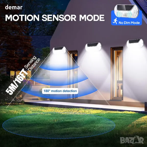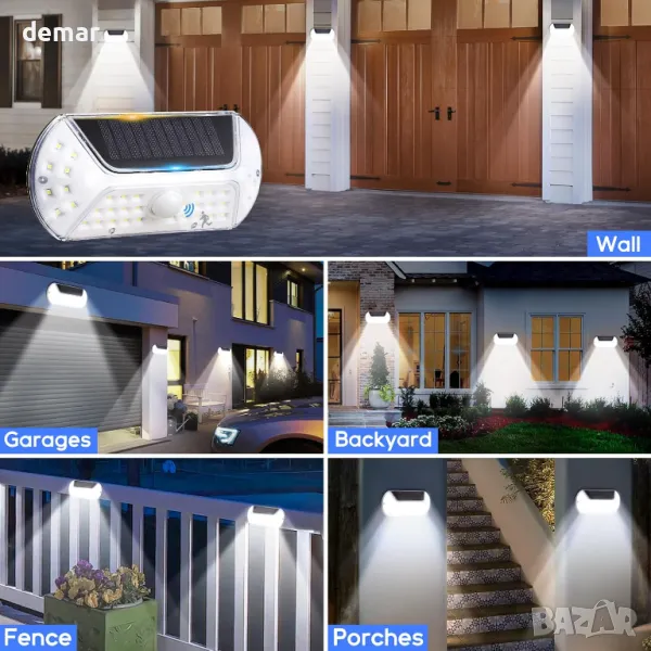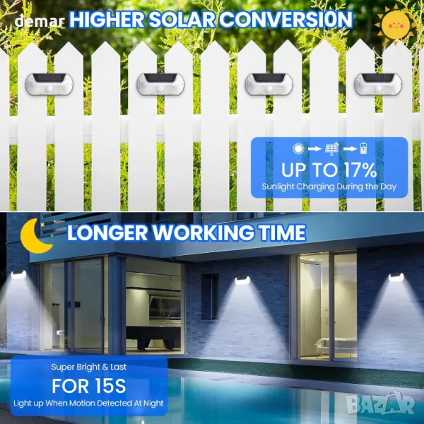 Соларни външни лампи със сензор за движение, които се активират при движение и автоматично се изключват. Интелигентен контрол на осветлението - зареждат се през деня и светят през нощта. Оборудвани с висококапацитетна литиева батерия и ефективен соларен панел за дълготрайна работа. Изработени от здрав ABS+PVC материал, с IP44 водоустойчивост, устойчивост на стареене, корозия и високи температури. Лесни за монтаж с прост двуетапен процес. Подходящи за балкони, пътеки, градини, дворове, стени, огради и паркове.