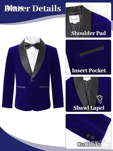 Костюмът за момчета 10/11г. е изработен от мек велур и вискоза, идеален за по-хладни сезони. Включва сако, черни панталони, бяла риза и черна папионка. Изисканият стил включва сатенена яка, подплатени рамене и разрез на сакото. Подходящ е за сватби, рождени дни и специални събития. Препоръчва се химическо чистене или ръчно пране в студена вода.