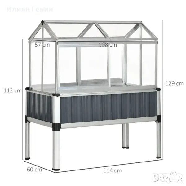 Габаритни размери: 114L x 60W x 112/129H cm. Продуктови данни на повдигнатото легло: 114 Д x 60 Ш x 66,5 В см. Продуктови данни за оранжерия: 108L x 57W x 63H cm. Капацитет на тегло: 50 кг.