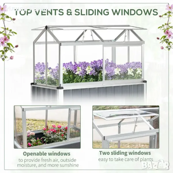 Покрив на панти: Покривът може да се отваря, за да влезе чист въздух и да се регулира температурата. По този начин вашите растения получават климата, от който се нуждаят, за да растат.