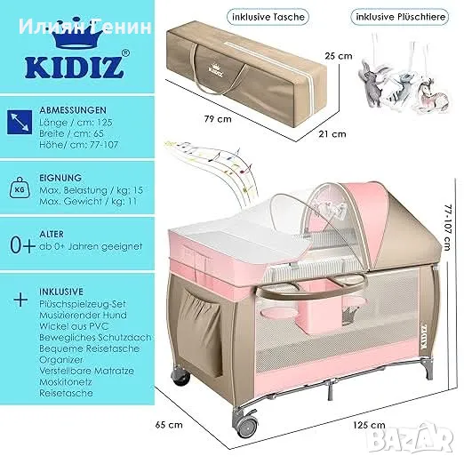 кошара за пътуване и кошара едновременно. Идеален е за деца между 0 и 3 години с телесно тегло до 15 килограма. Висококачествената повърхност за лежане е с изключително удобна повърхност за лягане и е изработена от еластична и издръжлива пяна с полиестерно покритие. Здравите странични стени са направени от въздухопропусклива мрежа и следователно осигуряват перфектна циркулация на въздуха.