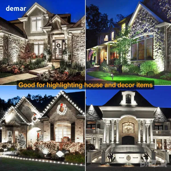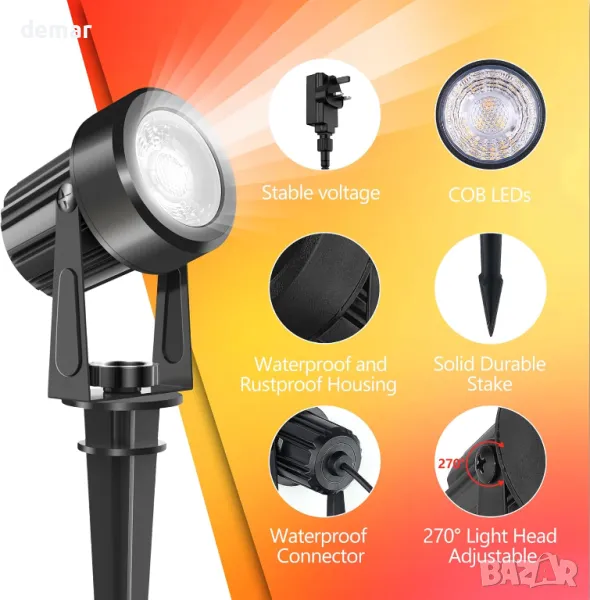 LED градински прожектори NATPOW с 6 глави, 3W COB LED, 6000K температурна светлина, създават бяла и по-мека атмосфера, идеални за осветяване на градина, трева, двор и пътеки. Светлините са с безопасно ниско напрежение и вградена трансформатор, изработени от алуминий и ABS за дълготрайност (до 50 000 часа живот). Използват напреднали LED COB чипове за по-ярко осветление, излъчващи до 3000 лумена с хладно бяло 6000K, подходящи за осветление на двор, пътеки и огради. Водоустойчиви по стандарт IP65, лесни за инсталация – просто поставете стойката в земята или монтирайте на стена. С кабел от 200 см и адаптер от 300 см, прожекторите предлагат 60° ъгъл на осветление и могат да се регулират на 270° за оптимално осветление на различни външни пространства.