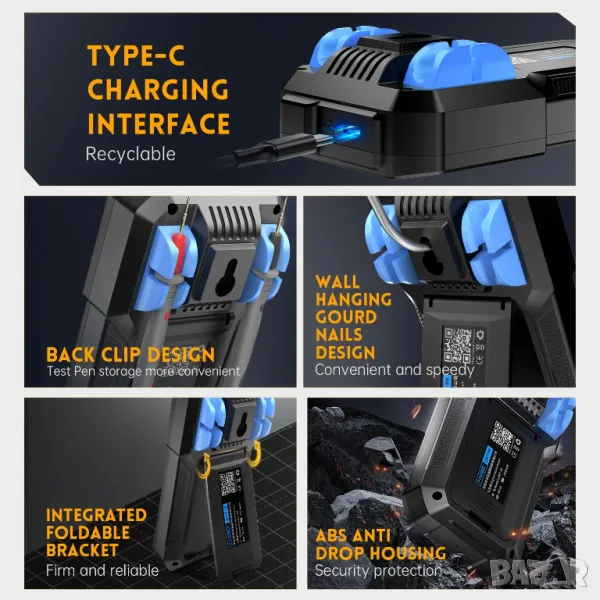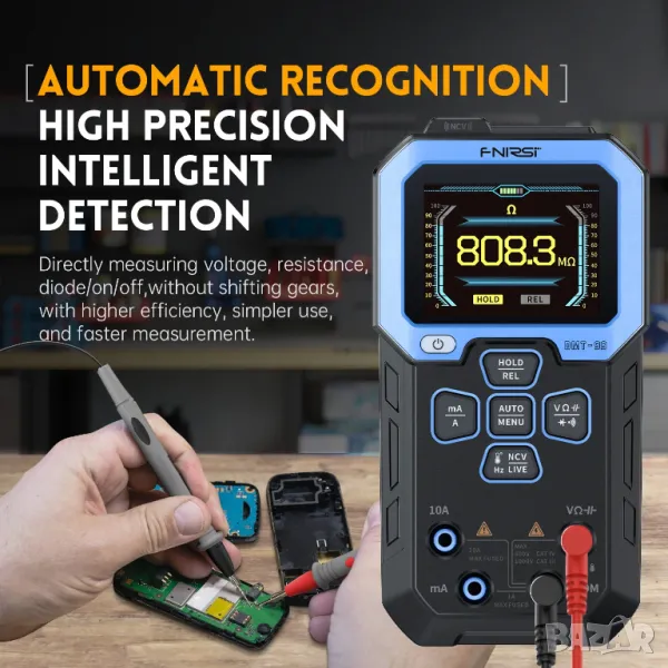 - Използване на мултиметър: тества проводимост, капацитет, честота, работен цикъл, съпротивление, диод, температура, NCV, проводник под напрежение и др.