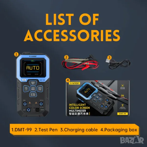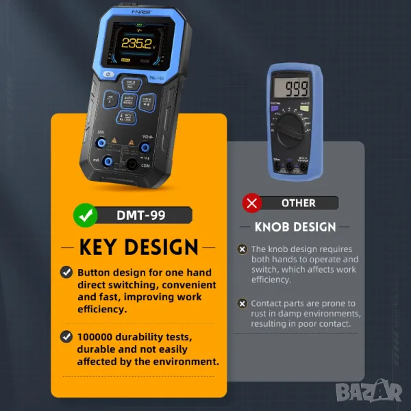 DMT-99 е наскоро пуснатият на пазара интелигентен цифров мултицет с 10 000 броя на FNIRSI, с по-широк диапазон на измерване и по-висока разделителна способност, който ви помага да измервате по-точни стойности.