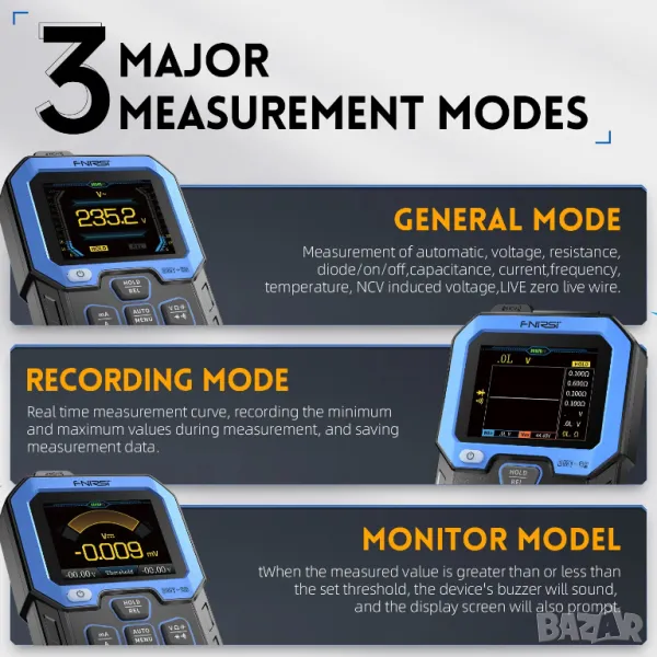 - 3 режима на измерване (запис, нормален и мониторинг)