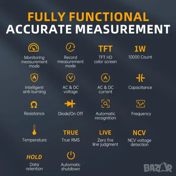 Той може точно да измерва AC/DC напрежение, AC/DC ток, 10A ток и може също да се използва за тестване на проводимост, капацитет, честота, работен цикъл, съпротивление, диод, температура, NCV, проводник под напрежение и др.