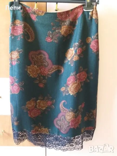 Елегантна, лека пола, състав вискоза. Подплата от ацетатна коприна. Тъмнозелен цвят. Дължина от талията до дантелата е 57 см, с дантелата 64 см. Талия 38-40 см, ханш 47 см1