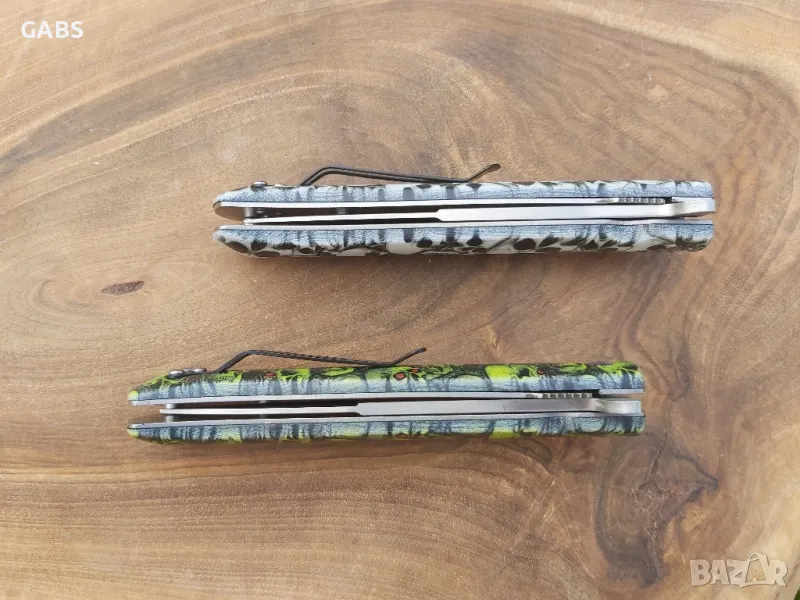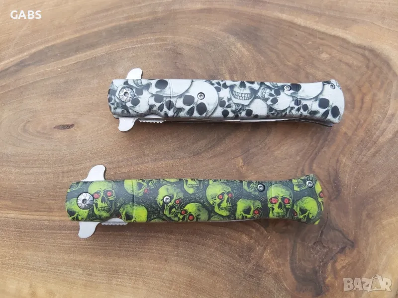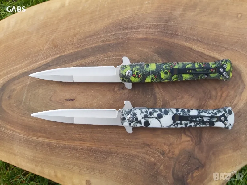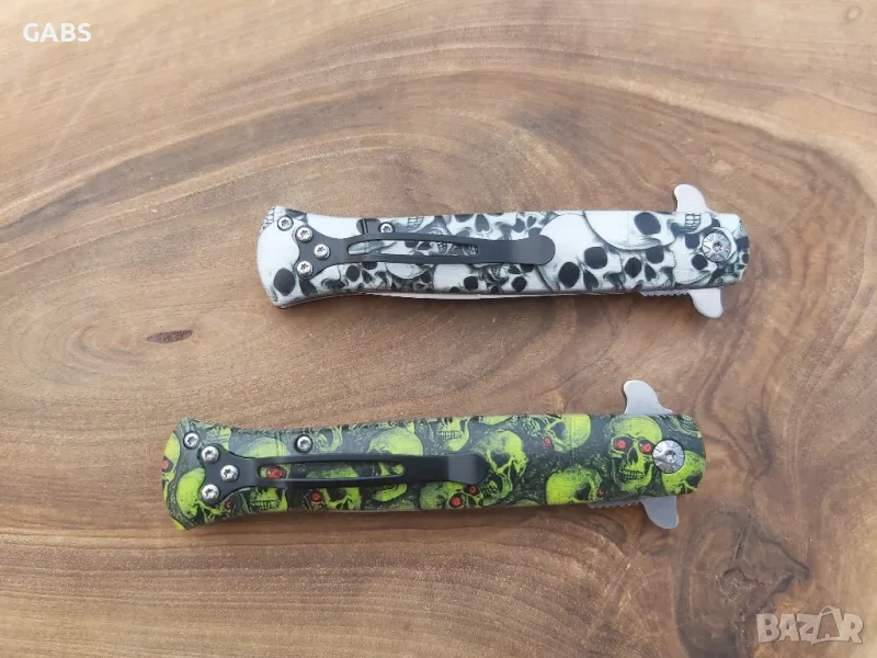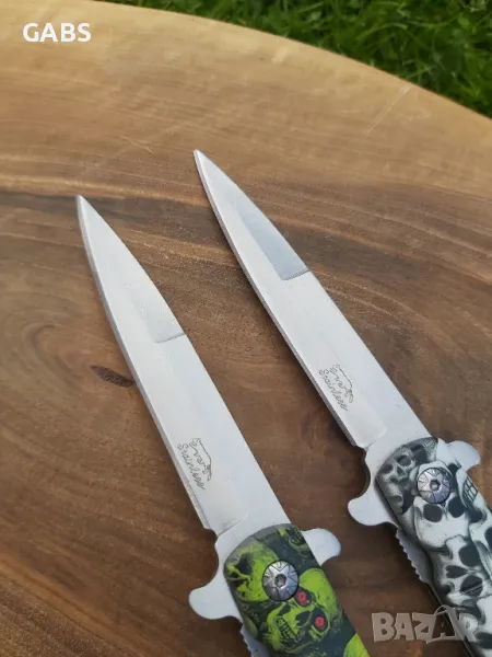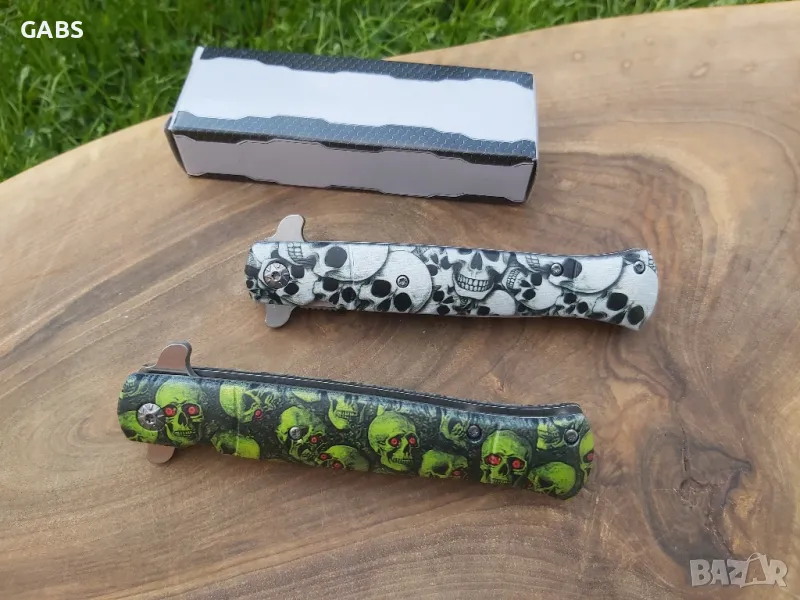 сгъваем нож с уникален дизайн на черепи. Острието е изработено от висококачествена стомана 420HC, осигуряваща надеждност и дълготрайност. Дръжката комбинира метал и полимер с цветен принт на черепи, което добавя индивидуалност и отличителност.