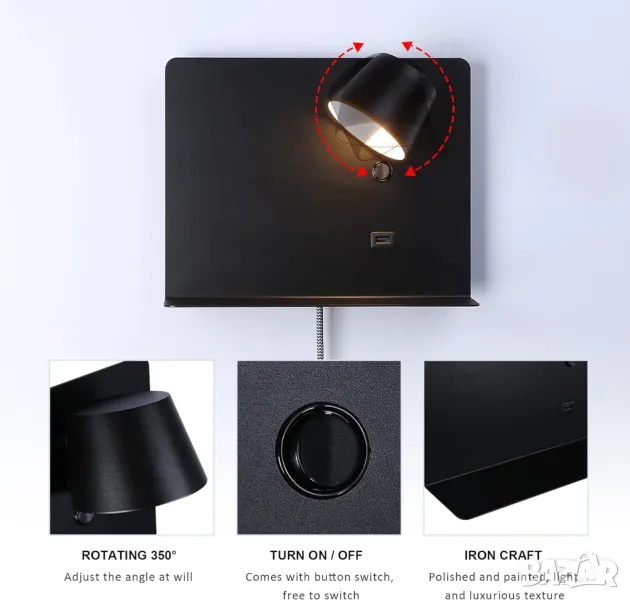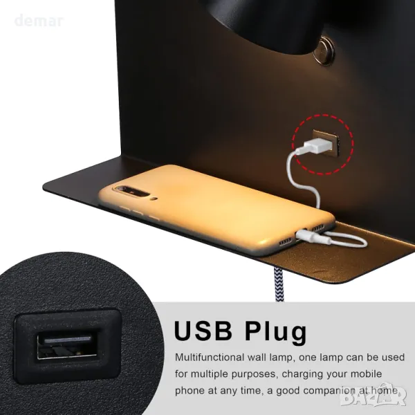 Стенната лампа разполага с удобен USB порт за зареждане на устройства, без нужда от допълнителни контакти. Алуминиевият рафт побира телефони, растения или декорации. Лампата осигурява топла светлина (2700K) с мощност 6W и равномерно разпръскване без отблясъци.