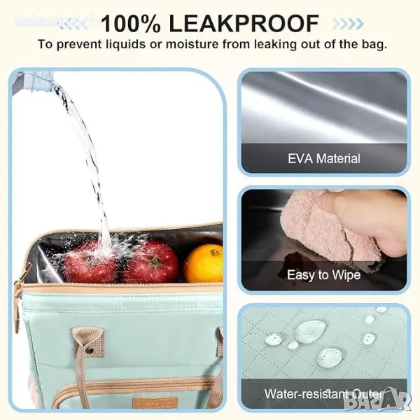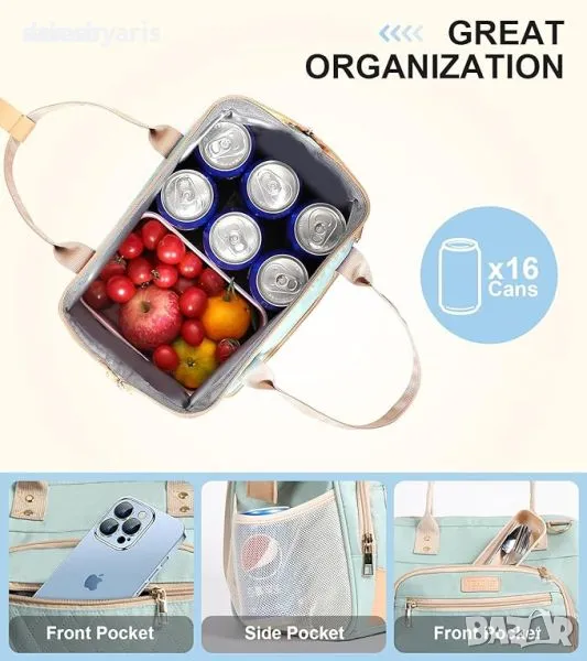 Издигнете стила си с тази лека и издръжлива чанта за обяд, създадена специално за жени. Изработен от 290D композитен плат, той предлага отлична устойчивост на износване и траен цвят. Множеството опции за носене включват подсилена горна дръжка и подвижна, регулируема презрамка. С размери 11Lx6.3Wx10.6H инча, той предлага достатъчно пространство и може да побере до 16 кутии от 330 ml напитки. Разполага с преден джоб с цип за основни неща и мрежести странични джобове за чадъри или бутилки с вода. Устойчив на течове и лесен за почистване с технология за безшевна алуминиева облицовка. Универсален за работа, приключения на открито, пикници и др.