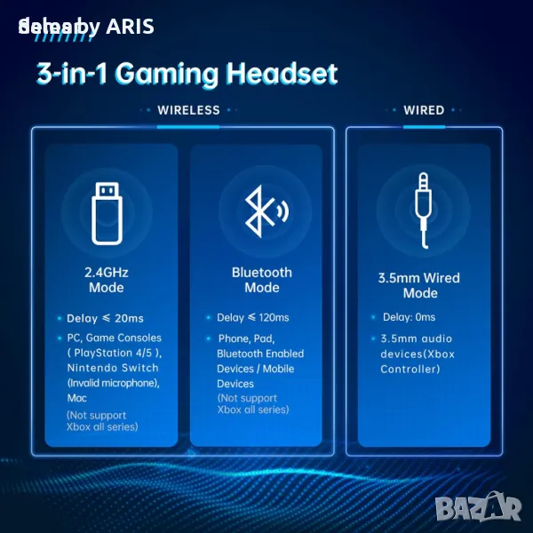 Безжичните слушалки за игри Captain 300 разполагат с усъвършенствана 2,4 GHz безжична технология, осигуряваща стабилна връзка до 49 фута и ниска латентност (≤20 ms) за поглъщащо игрово изживяване. Неговите 50 мм драйвери подобряват качеството на звука, позволявайки на играчите да чуят всеки детайл. Свалящият се шумопотискащ всепосочен микрофон предлага ясна комуникация. Тази слушалка може да се похвали с разнообразни опции за свързване, включително 2,4 GHz безжична, Bluetooth 5.2 и 3,5 мм кабелна връзка, което я прави съвместима с множество платформи като PS5, PS4, PC, Mac и др. Проектиран за комфорт, той има подплатени регулируеми ленти за глава и антифони с мемори протеин за дълги игрови сесии. С до 40 часа живот на батерията и стилен дизайн на огледална повърхност, тези слушалки обединяват функционалността с модата, подходящи за различни настройки извън игрите.