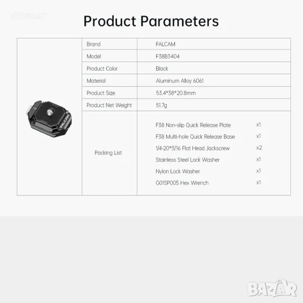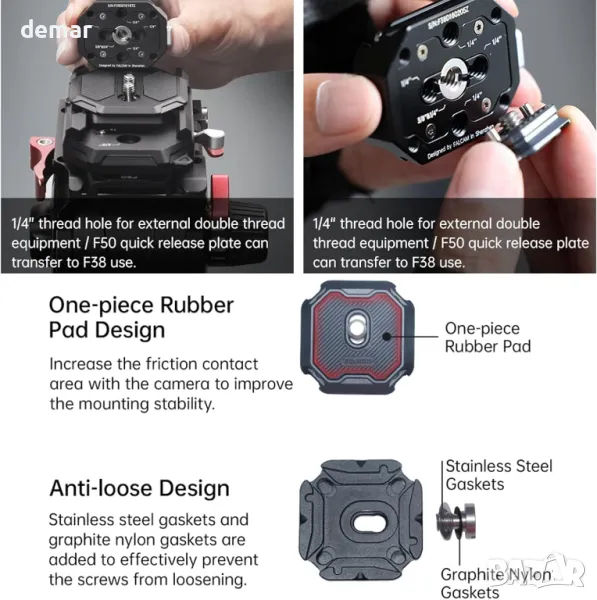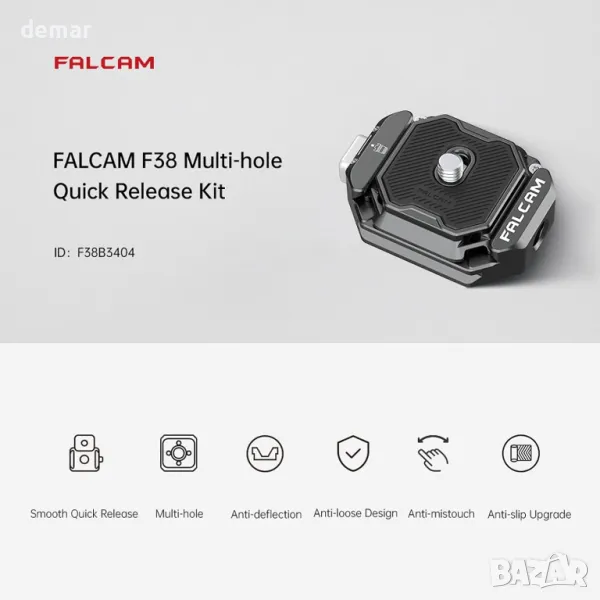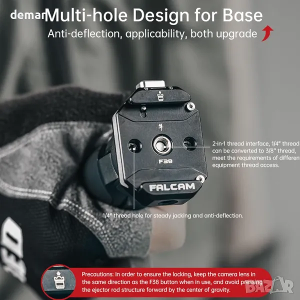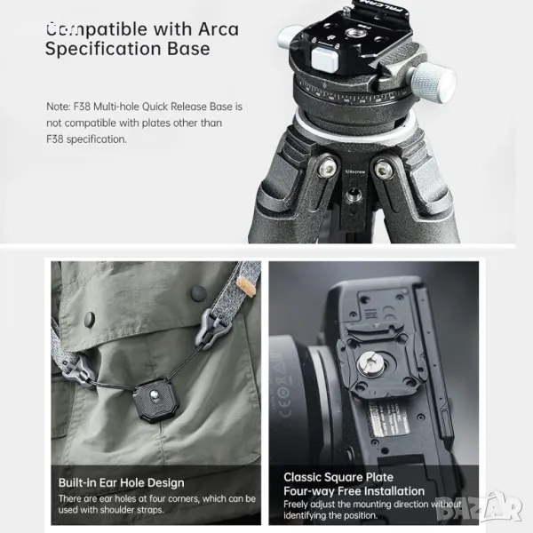 FALCAM F38 комплект за бързо освобождаване с иновативен дизайн, който съчетава древна китайска конструкция с модерна механика за лесно и бързо монтиране и демонтиране. Разполага с многодупков дизайн и 2-в-1 интерфейс за преход от 1/4" към 3/8" винт, осигуряващ стабилност и анти-дефлекция. Новата структура предотвратява неволно натискане и предлага подобрена стабилност и захващане. Вградените отвори за ремъци позволяват използване с раменни колани.