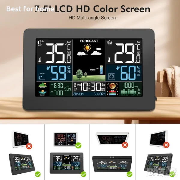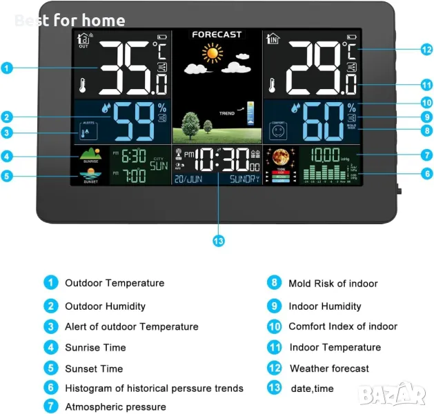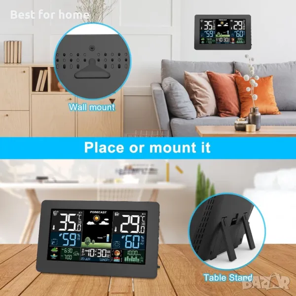 метеорологична станция на закрито на открито, безжичен термометър с дистанционен сензор, домашна метеорологична станция, цветен дисплей, цифрова прогноза за времето, влажност, атомен часовник, въздушно налягане за дома