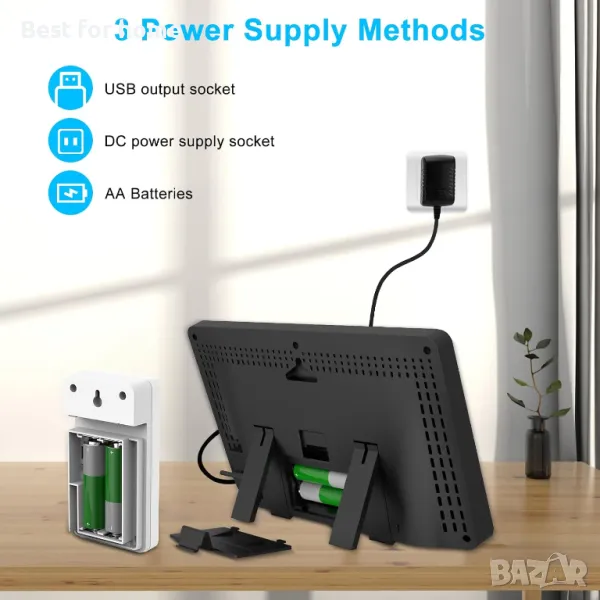 【Забележка】 Метеорологичната станция може да се захранва от адаптер (включен), USB кабел (не е включен) или 2 AA батерии (не са включени). Сензорите за безжично дистанционно управление могат да се активират с 2 AA батерии (не са включени).