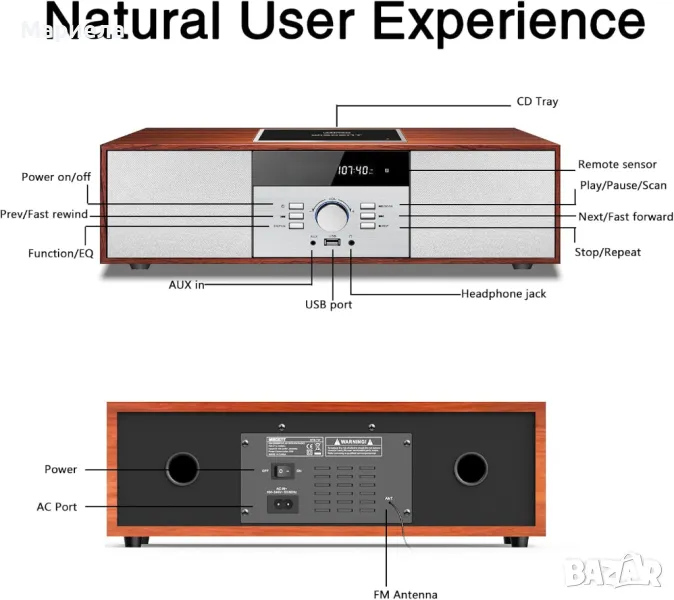 FM радио: Имате и двете опции, да настроите ръчно или автоматично да сканирате и предварително зададете до 30 станции, за да настроите любимите си канали за извикване с едно докосване. (Забележка: Има мека антена с дължина около 35,4 инча на гърба на стерео системата. Моля, поставете меката антена на по-високо място, за да получите по-добро качество на приемане на сигнала. FM радио 87,5-108 mHz, НЕ AM.)