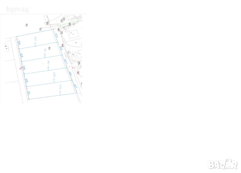 Разделен на 5 парцела. С лице към асфалтов път. 20m на. Парцел.