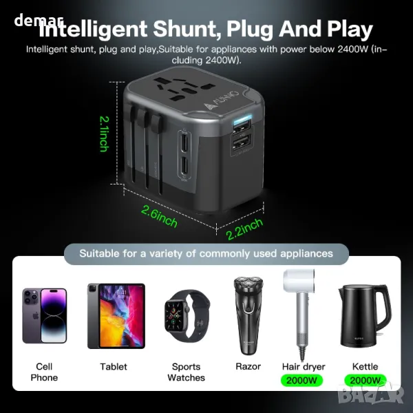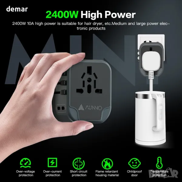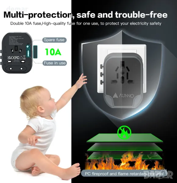 Адаптерът за пътуване AUNNO предлага съвместимост по целия свят с вградени щепсели за Обединеното кралство, ЕС, Австралия и САЩ, които могат да се използват в над 150 страни. С максимална мощност от 2400 W, той разполага с два USB и два USB-C порта с интелигентно регулиране на мощността. Безопасността е осигурена с РС огнеупорен материал, предпазител 10A и множество сертификати, включително UKCA, CE, FCC и ROHS. Компактният и лек дизайн го прави преносим и удобен за пътуване, спестявайки място в багажа, без да прави компромис с функционалността.