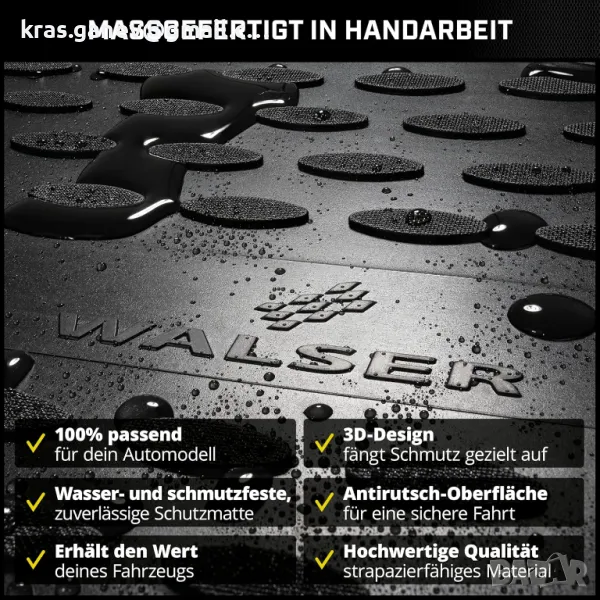 Надеждни стелки за кола – в сравнение с универсалната стелка за кола, стелките за кола Walser са специално изработени и следователно 100% перфектно пасват на пространството на краката ви. Така здравите и издръжливи гумени стелки за кола предлагат най-добрата защита за вашия автомобил във всяка ситуация – независимо дали срещу мръсотия, влага, сняг, нацепване, сол и др. Можете да разчитате на гумените стелки за кола