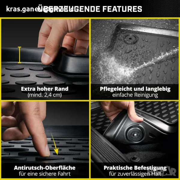 Лесна за поддръжка кола с гумени стелки – колата с гумени стелки може лесно да се постави в пространството за краката на колата. Ако гумените стелки за автомобил се замърсят, те могат лесно да се измият с маркуч. Стелките за кола могат да се почистват и с машина за миене под налягане (спазвайте разстояние от около 15 см)
