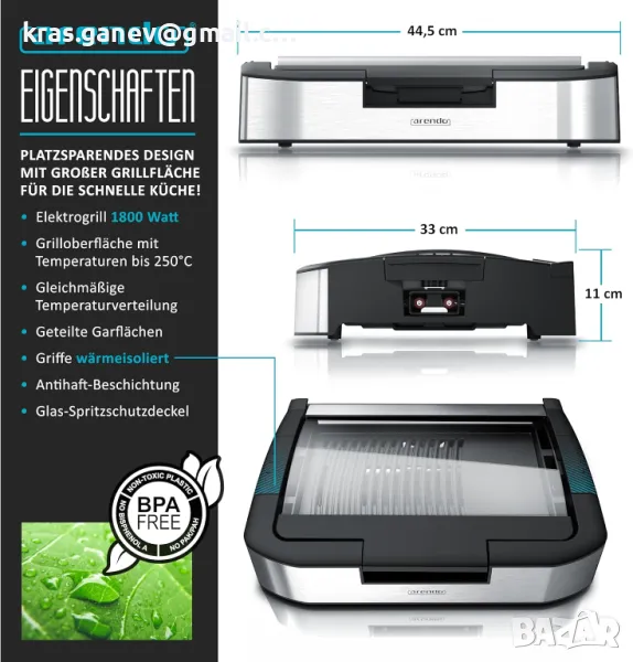 Силните страни: електрически настолен грил 1800 W с подвижен стъклен капак (защита срещу пръски) | голяма повърхност за грил (35 x 24 cm) | разделени грил повърхности за месо и зеленчуци | незалепващо покритие | лесно сваляща се тава за събиране на мазнини | терморегулатор с 5 степени | дръжки топлоизолирани | безопасност: включената захранваща връзка предотвратява отстраняването на нагревателната повърхност по време на работа.
