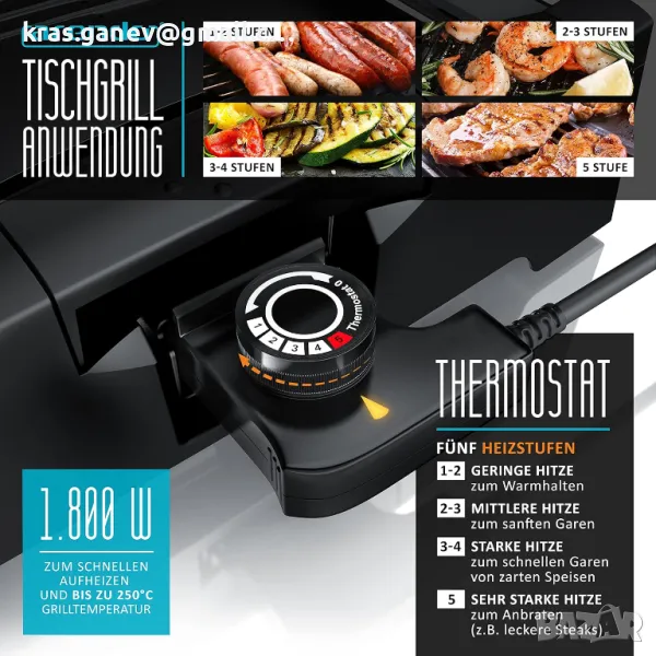 Мощен: нагревателният елемент доставя 1800 вата и по този начин достига температура до 250 °C на повърхността на скарата особено бързо. Контрол на температурата с 5 нива: от поддържане на храната топла (ниво 1) до печене на пържоли (ниво 5).