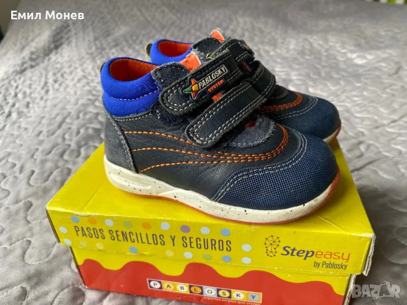 Продавам детски обувки, маратонки “Pablosky”. Цена 40 лв. Номер 21. Дължина на стелката 13,5 см. Цвят: тъмно синьо с оранжева подметка. В отлично състояние. Малко са носени. С кутия. Естествена кожа отвън и отвътре. Произведени от свръх устойчиви и дълготрайни материали. Подметката гарантира за максимална здравина и перфектно сцепление. Закопчаване с велкро лепенки. Унисекс модел.
