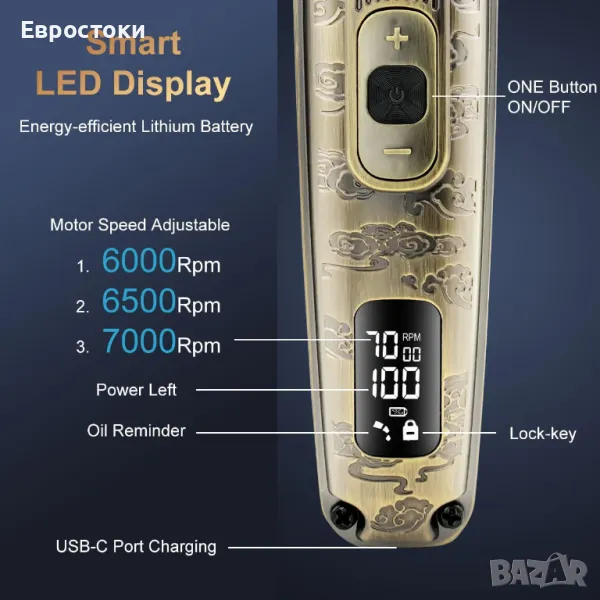 Тримерът може да се зарежда през USB и може да работи 180 минути при пълно зареждане за 1,5 часа. Безжичен дизайн, LED дисплей и функция за заключване с едно докосване за вашия бизнес или удобство при пътуване. Този тример за брада е с ергономичен дизайн за лесна употреба.