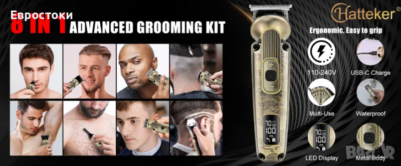 Hatteker Машинка за подстригване. Комплект за подстригване на брада T-Blade, на мустаци, водоустойчив тример за нос и тяло 8 в 1. Регулируема скорост. Бронз