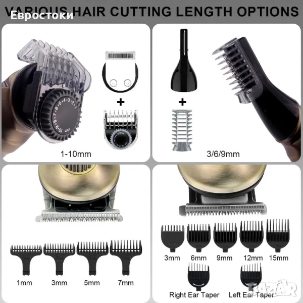 Комплектът за подстригване включва машинка за подстригване с T-образно острие с 4 водещи гребена (1 мм, 3 мм, 5 мм, 7 мм), 7 водещи гребена (3 мм, 6 мм, 9 мм, 12 мм, 15 мм, ляв и десен ред гребени)
