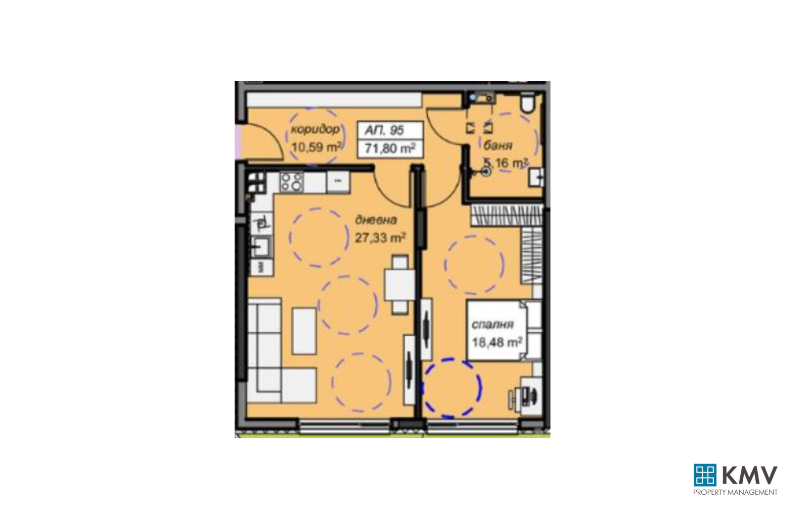 Имотът, който предлагаме се намира на 1-ви етаж, застроената му площ е 71,80 кв.м. изложението на имота юг, а разпределението му е както следва: входно преддверие, всекидневна с кухненски бокс /27,33 кв.м/, спалня /18.48 кв.м/ и баня с тоалетна.