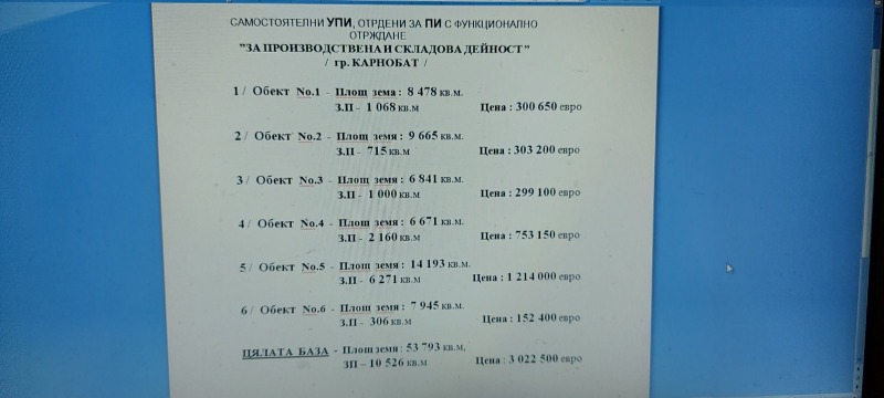 ЕКСКЛУЗИВ.НАМАЛЕНА ЦЕНА. FRIENDS HOUSE предлага за продажба производствена складова база в промишлената зона на гр.Карнобат. Базата е напълно самостоятелна, разположена на площ от 53 793 кв.м, и прилежащ сграден фонд със ЗП - 10526 кв.м, представляващ производствени халета, складови помещения, офиси и административни сгради, сервизни помещения ( може и с подемниците ), и други налични постройки и помещения. Имотът е разположен в промишлена зона, в непосредствена близост до товарна гара, в съседство с много действащи производствени и складови предприятия, в близост до централната част на града. Добра инфраструктура, осигуряваща безпроблемен целогодишен достъп. Имотът има възможност да бъде разпродаден и на отделни модули съответно с прилежащата към тях земя и застроен сграден фонд, по избор на клиента. Относно районът - може да бъдат закупени площи по избор на клиента според необходимостта и естеството на дейността, заедно със съществуващият