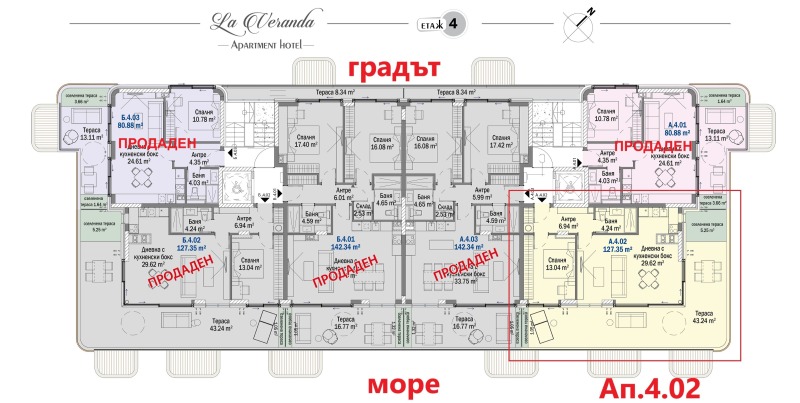 🏡 Апартамент А.4.02 се състои от антре, 1 спалня, баня с тоалетна, просторна дневна с кухненски бокс и голяма тераса с уникална гледка към морето.