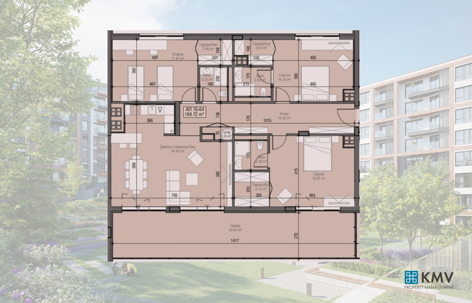 Жилището разполага със застроена площ от 189,72 кв.м., а разпределението е както следва: входно антре, всекидневна с кухненски бокс, три спални всяка от тях с гардеробна, три бани и тераса с площ от 40 кв.м.