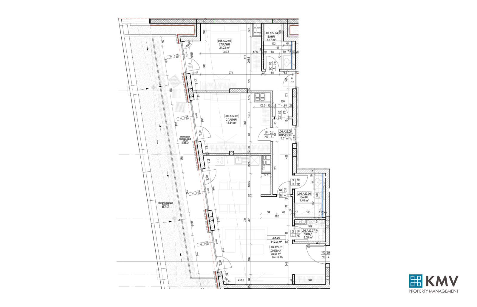 Имотът, който Ви предлагаме се намира на шести жилищен етаж на сградата има застроена площ 112,3 кв.м. и тераса 32 кв.м а изложението му е запад/изток.