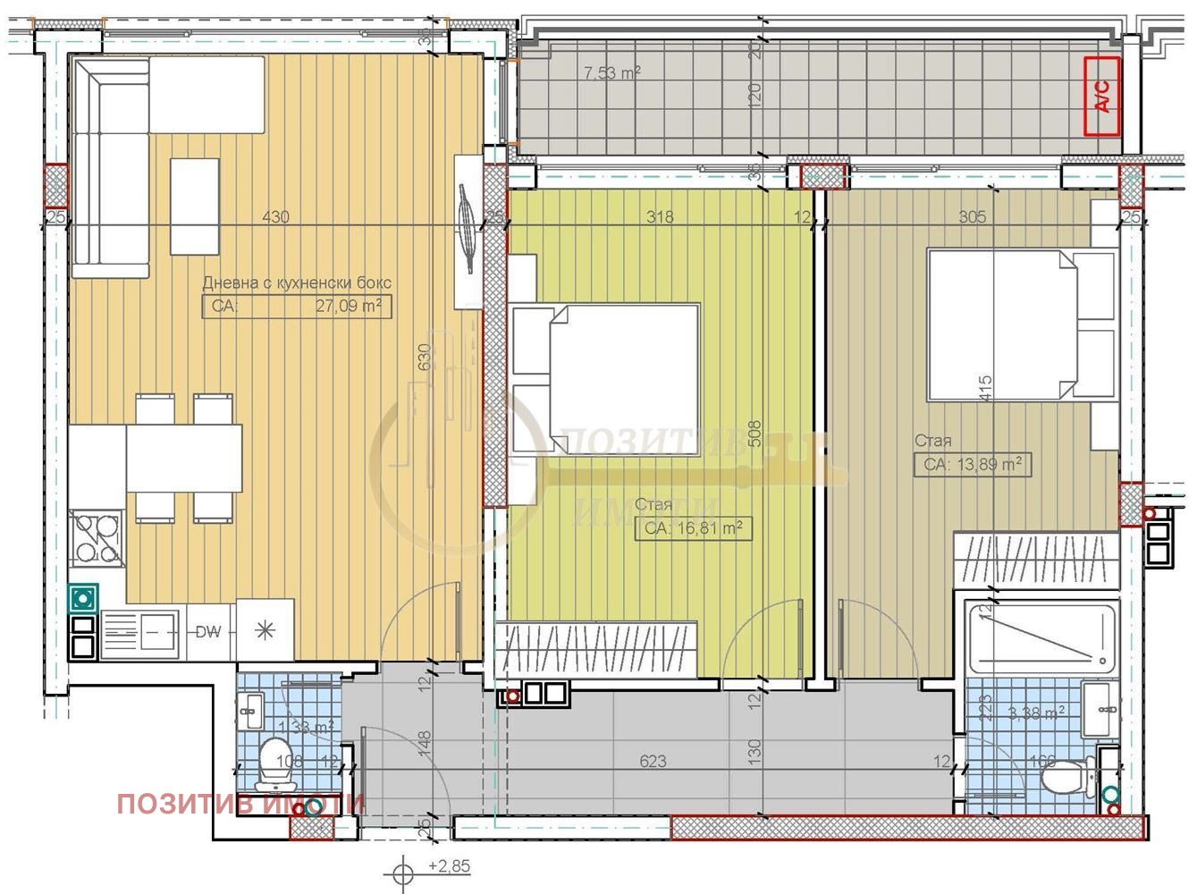 Отоплението е решено на газ, като има и изводи за климатик. Изложението е запад!
