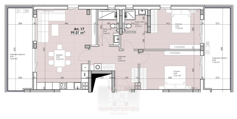 Тераси: две големи тераси - 16,64 кв.м. и 17,25 кв.м.