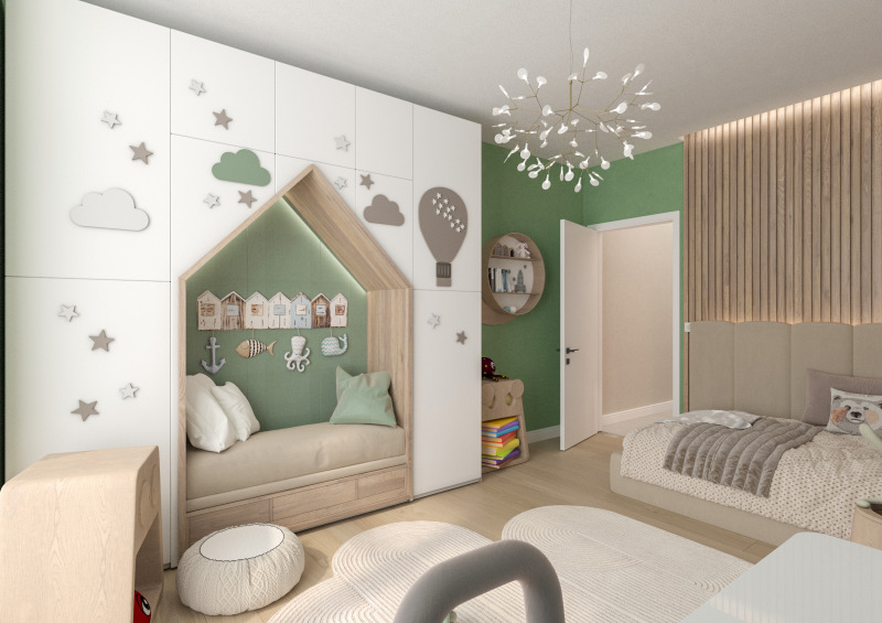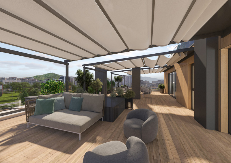 Жилището е на етаж 6, с изложение изток-юг-север, светла височина 2,80 м, просторна всекидневна с кухня - 59 кв.м, четири спални, три бани и тераса с площ 118,37 кв.м, предлагаща изключителен комфорт и панорамни гледки към Младежки хълм. Идеалното място за релакс, слънчеви следобеди и стилни вечери под открито небе. Перфектно пространство за зелена градина, зона за барбекю или външен кът за отдих.