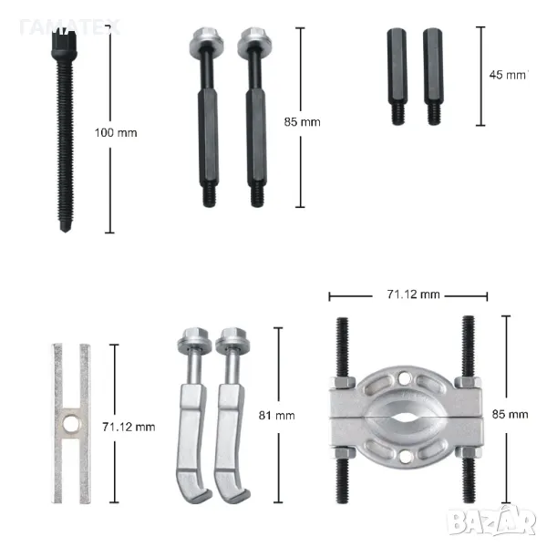 Съдържание: Сепаратор Ø15-58мм 2 x челюст 50 мм, аксиален винт, 2 x удължителен прът 45 mm, 2 x удължител 30 mm, рамо.