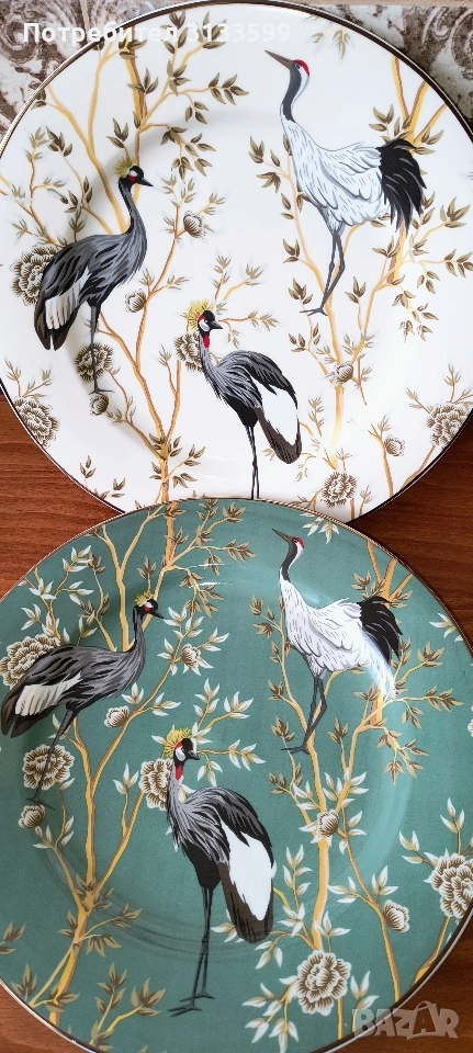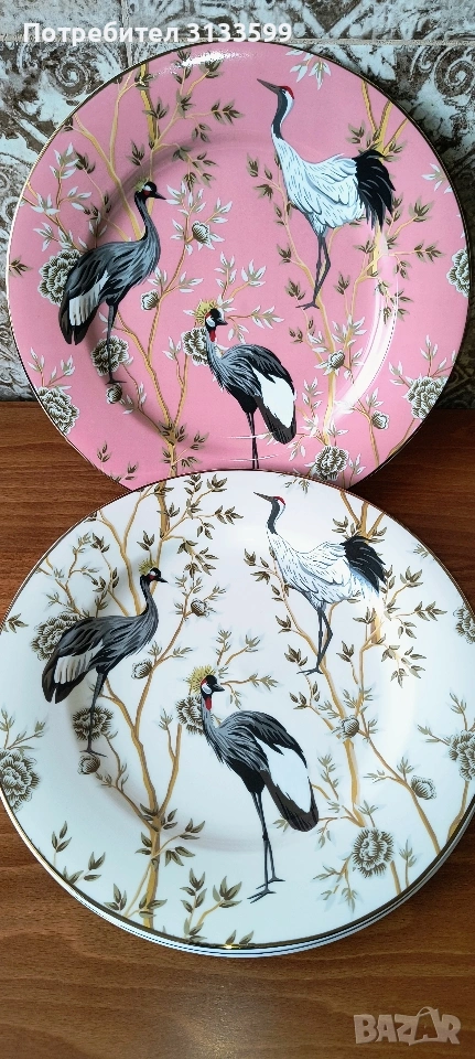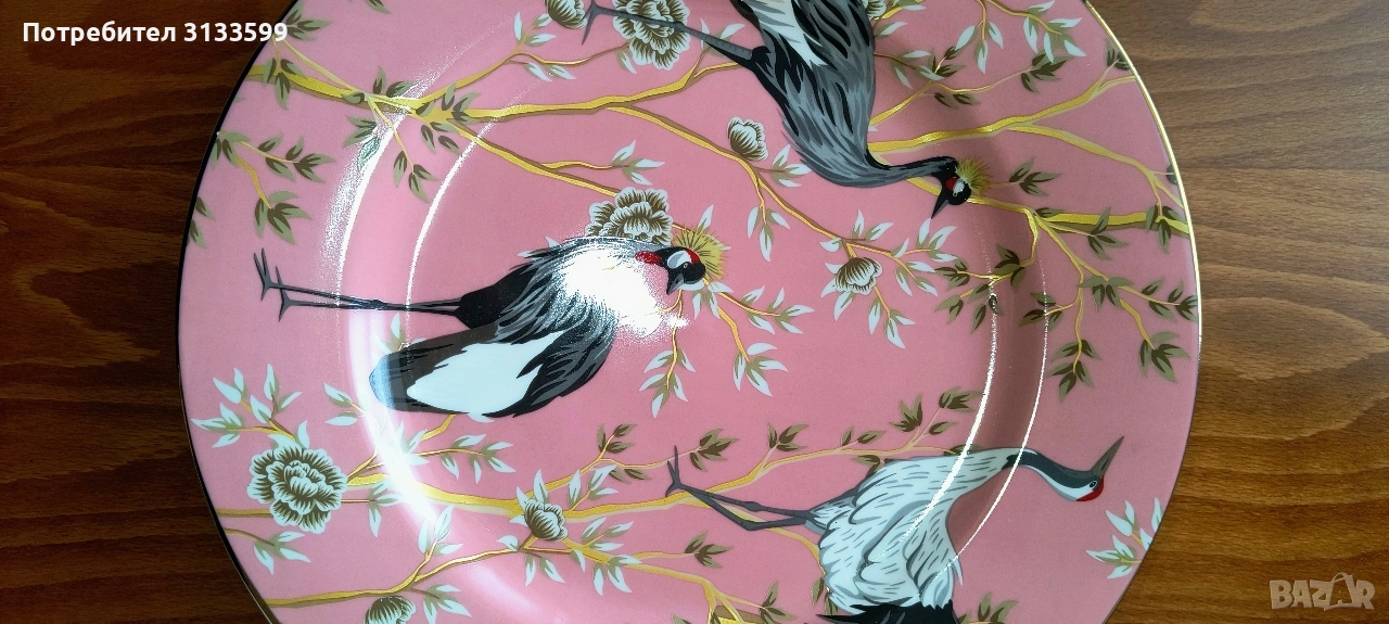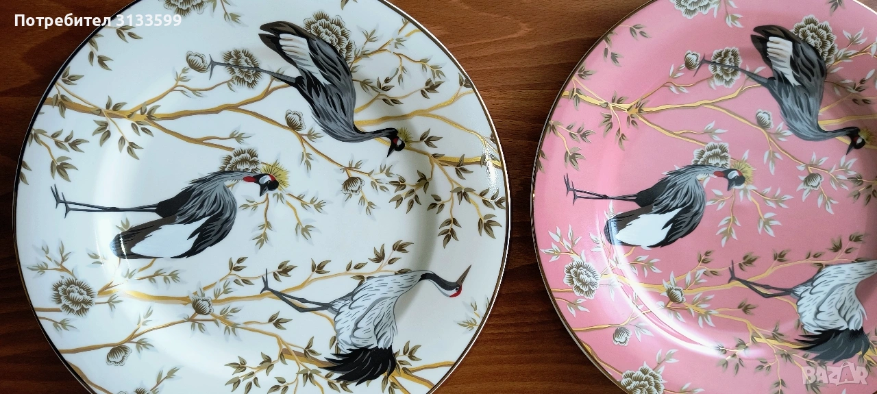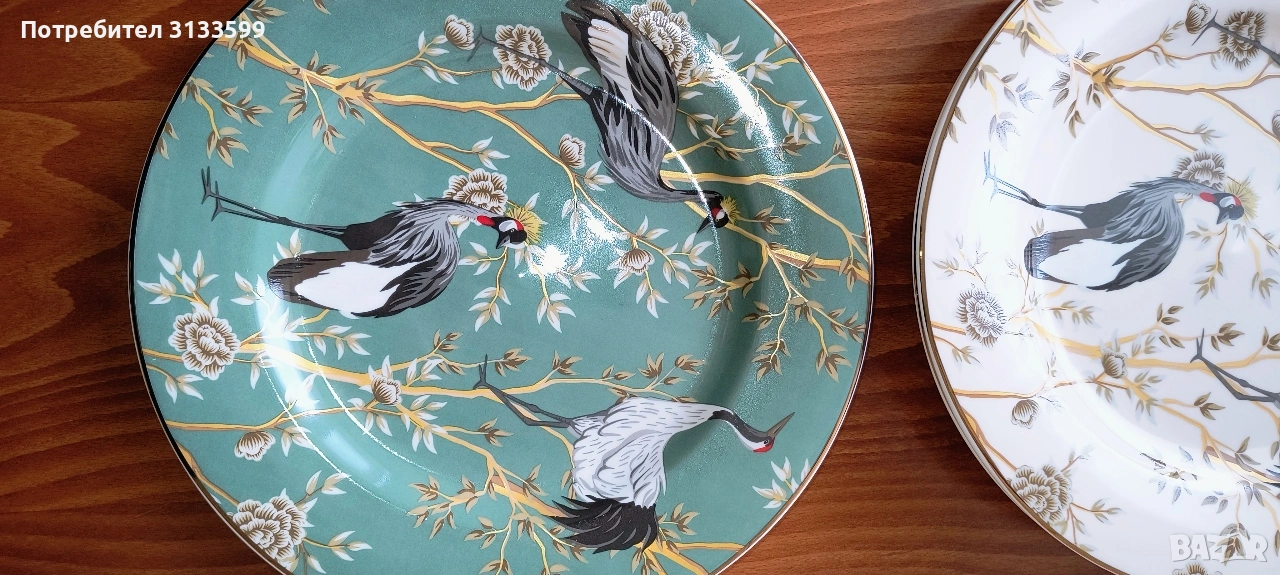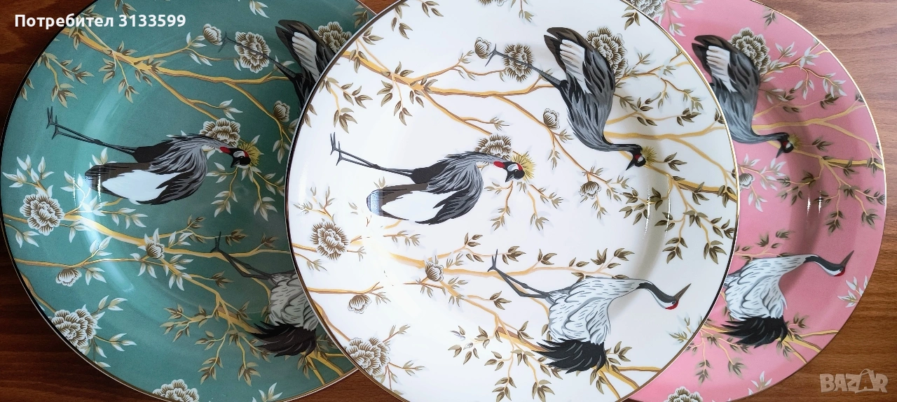 - Комплект от три чинии Krano от Boltze, Германия. Чиниите са с уникален принт с жерави в меки цветове. Материал: керамика. Диаметър: 27 см. Цвят: зелено, розово, кремаво. Цена: 43 евро.