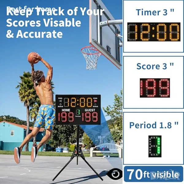 Табло за игра - Резултат, време, период, притежание на топката и бонус са добре видими, показани на електронното табло (9,8x14,8 инча). 3in&1.8in цифров може да се види ясно в рамките на 70 фута. Това табло е идеалният спътник за спортни лиги, турнири и тренировки