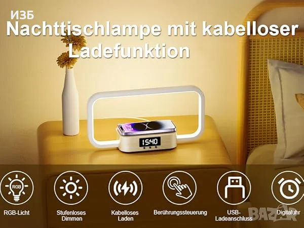 Нощна лампа с безжично зарядно устройство 10 W, RGB 7 цвята Безстепенно затъмняване и сензорно упр.