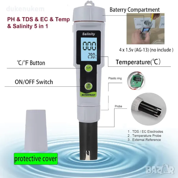 pH тестер, тестер за вода, тестер за аквариум, тестер за басейн, измерване на сол, тестер за СПА, тестер mumisuto, водоустойчив тестер