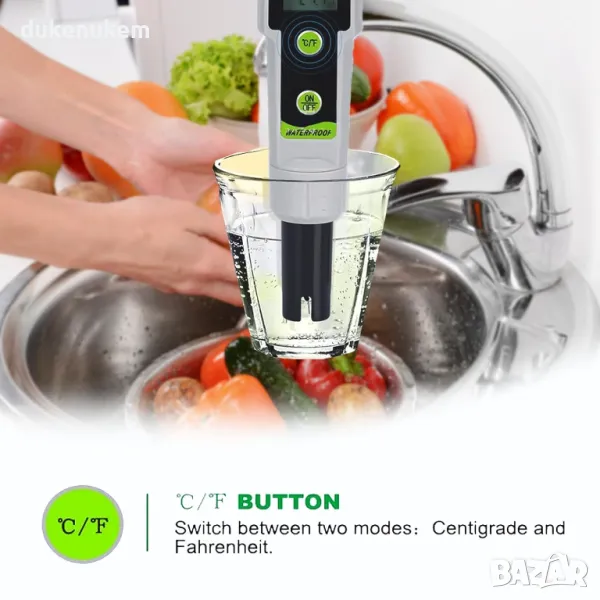 Многофункционален тестер: Измерва соленост в диапазон от 0 до 199.9 PPT, с възможност за превключване между Целзий и Фаренхайт.