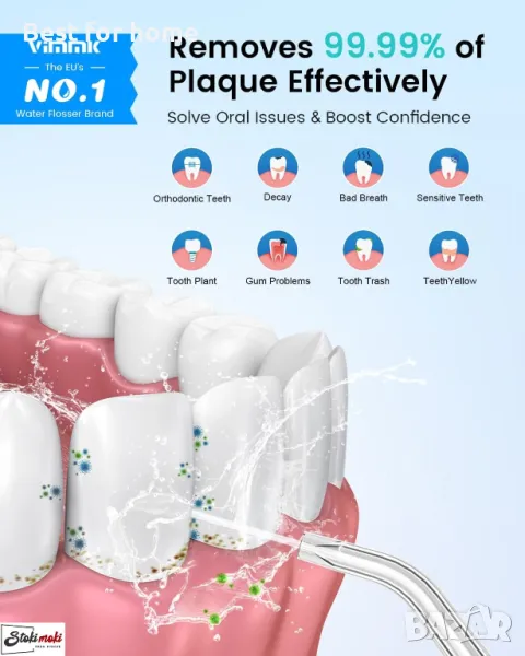 Има усъвършенствана 0,6 mm високоефективна импулсна технология с 1400-1800 импулса в минута и 30-110 psi водно налягане. Ефективно прониква дълбоко в пролуката на зъбите и премахва 99,99% от остатъците от храна и плаката. Ефективно решава лошия дъх, ортодонтията и други орални проблеми, осигурявайки непрекъсната грижа за оралното здраве и уверен свеж дъх.